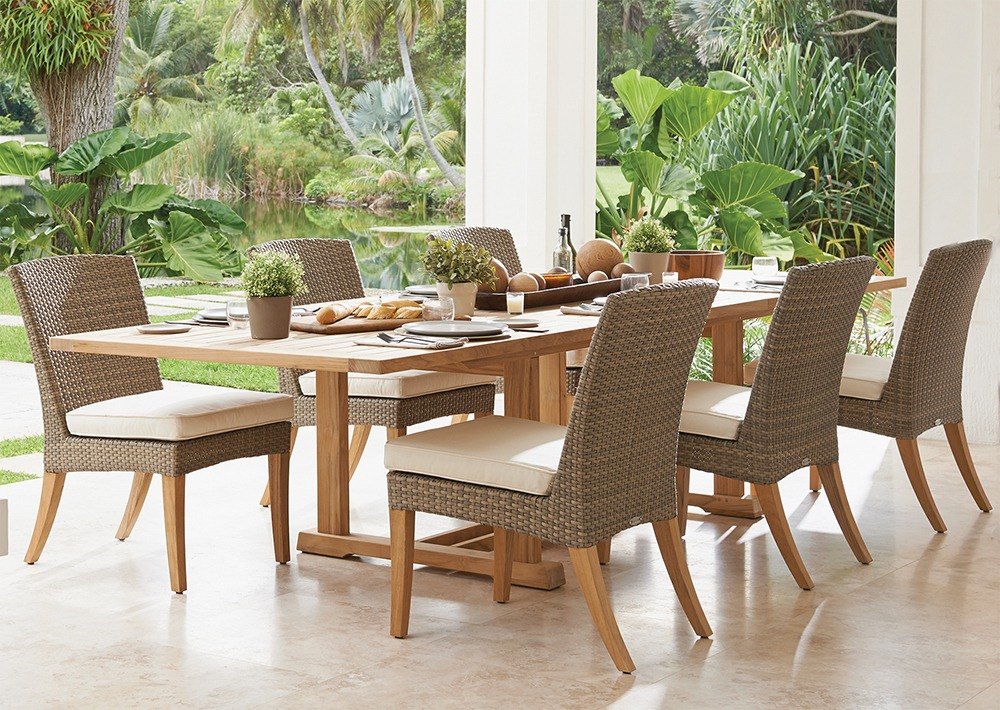 Invite nature to your table with artfully woven chairs and a sleek teak dining set. Designed for durability and ultimate comfort, this collection elevates any garden or patio gathering.